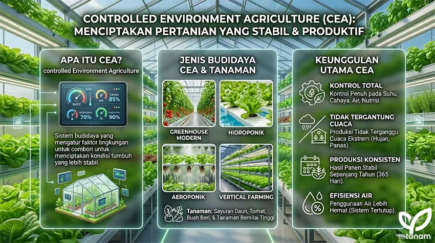 Controlled Environment Agriculture (CEA) adalah sistem budidaya yang mengatur faktor lingkungan seperti suhu, cahaya, kelembapan, air, dan nutrisi. Dengan sistem ini, petani bisa menciptakan kondisi tumbuh yang lebih stabil.